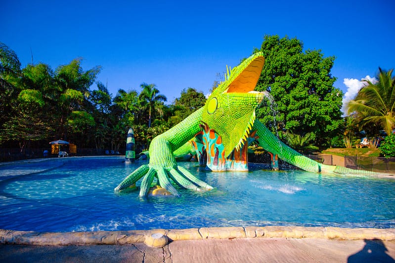 Una imponente y hermosa iguana cobra vida mientras avanza hacia el río en busca de frescura. Sube a su lomo y deslízate por su cola en un divertido tobogán que te llenará de alegría y aventura.